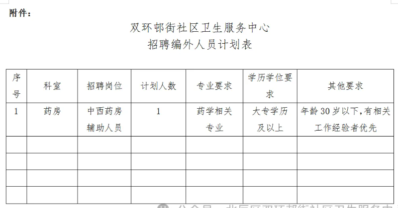 具体招聘的岗位、人数和条件详见附件1《北辰区双环邨街社区卫生服务中心招聘编外人员计划表》。