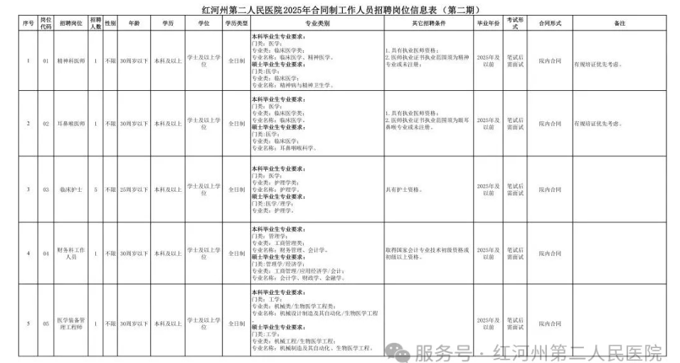 详见红河州第二人民医院2025年公开招聘合同制人员岗位信息表第二期(附件1),专业类别详见《硕士、本科专业目录》(附件2)。